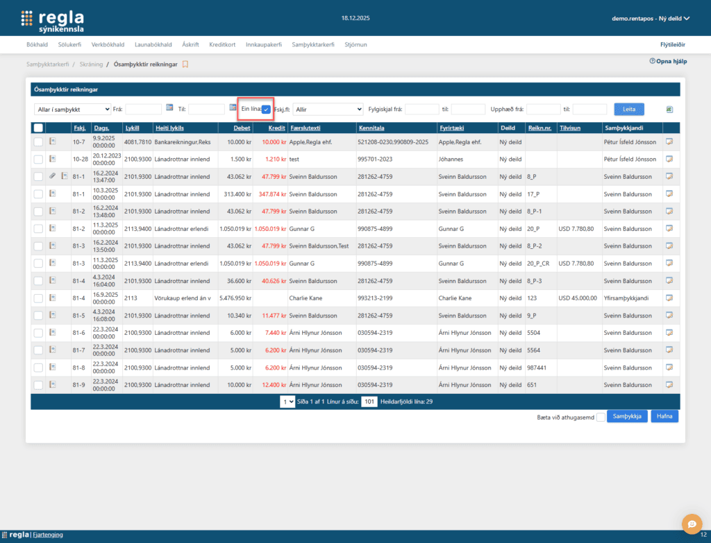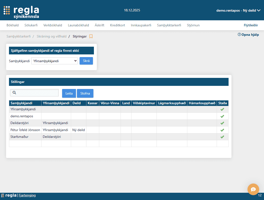 Nýleg virkni býður upp á það að bæði er hægt að samþykkja reikninga og ákveðnar færslur. Einfalt er að taka kerfið í notkun og stilla upp samþykktarferli og samþykkjendum.